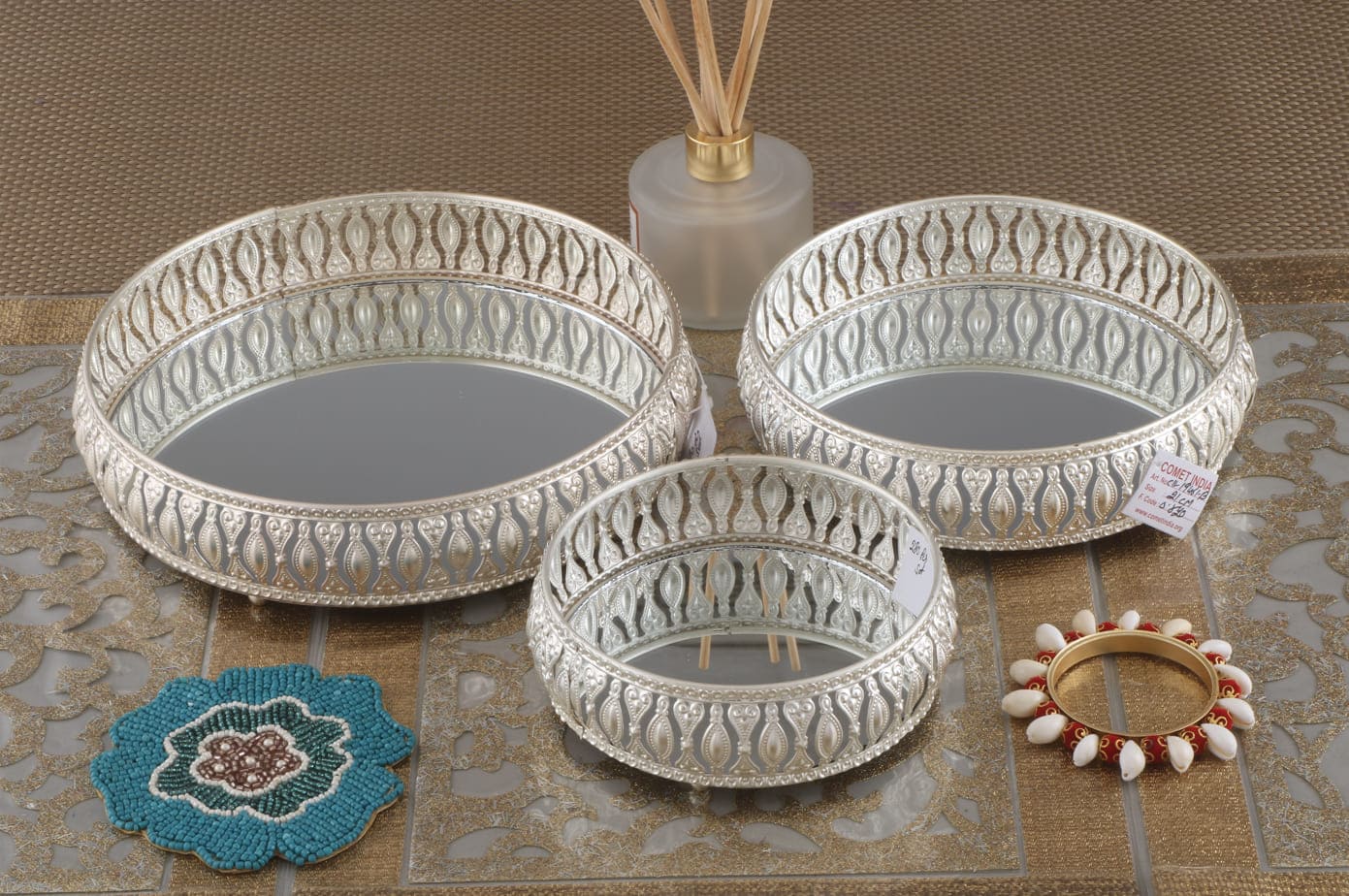 Trays in the classic white and golden colours that is perfect for the dressing table. The decorative tray can be used as a vanity tray, perfume tray or a tray to keep lipsticks, trinkets, brushes and types of makeup products.
